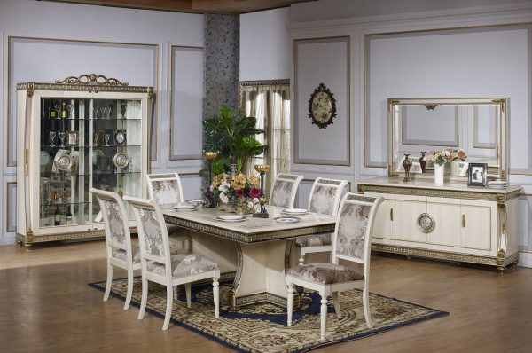 8 SEATER DINING SET-(1 TABLE + 2 ARM CHAIR + 6 SIDE CHAIR) – RM15,999.00 BUFFET + MIRROR – RM5,999.00 4 DOORS CELLARET – RM7,999.00